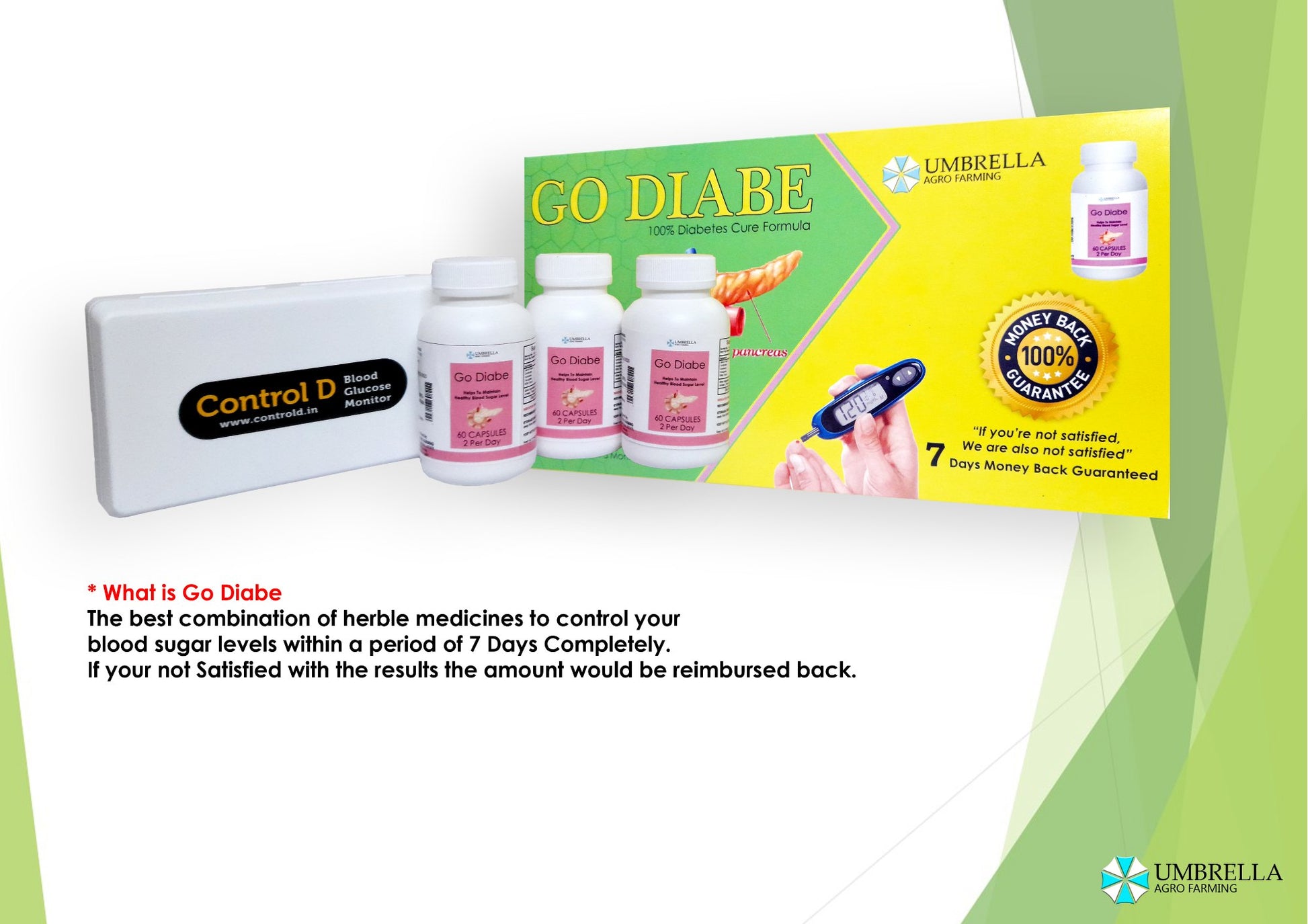 Go Diabe is the best combination of herbal medicines to control your blood sugar levels within a period of 7 days. If your not satisfied with the results the amount would be reimbursed back.